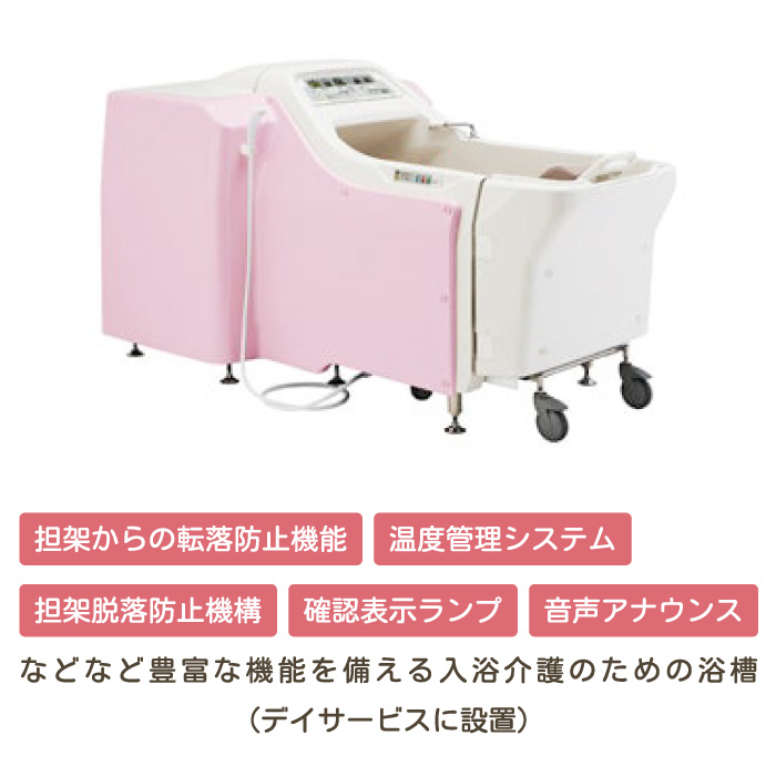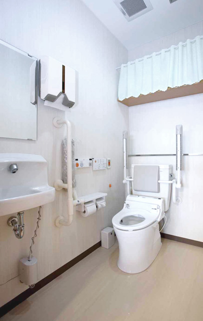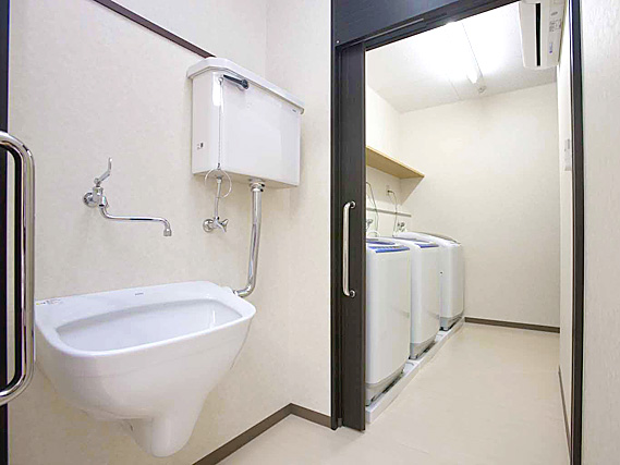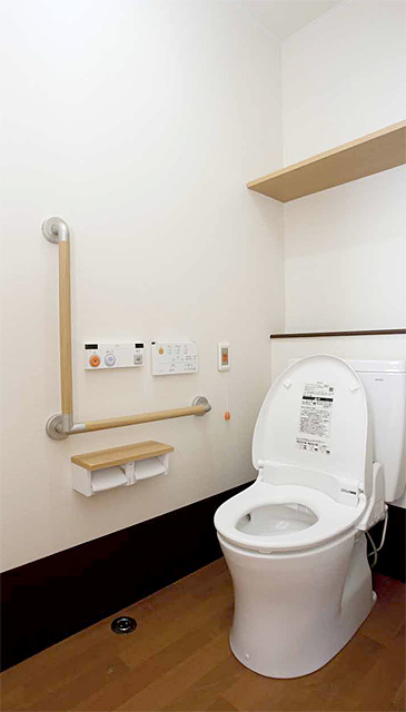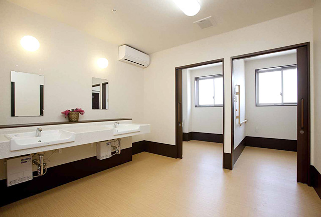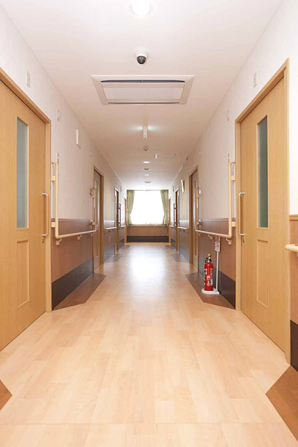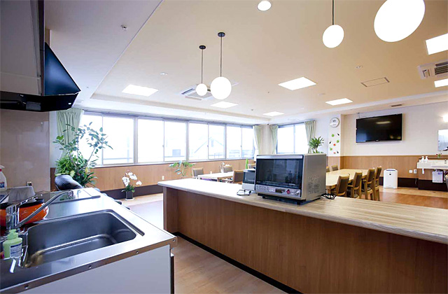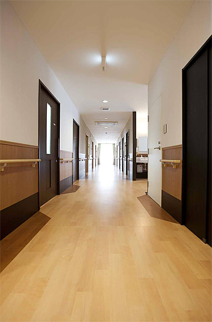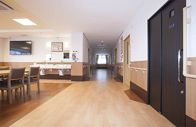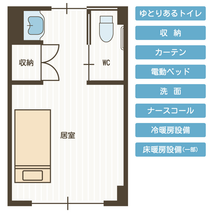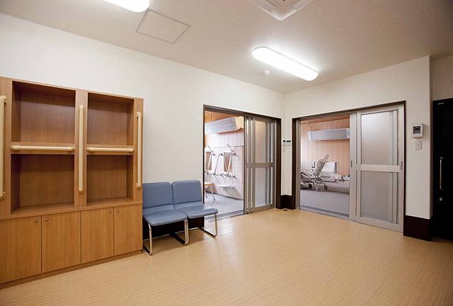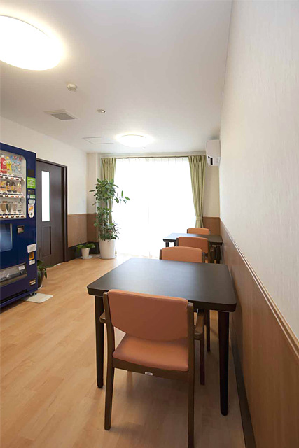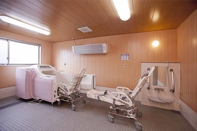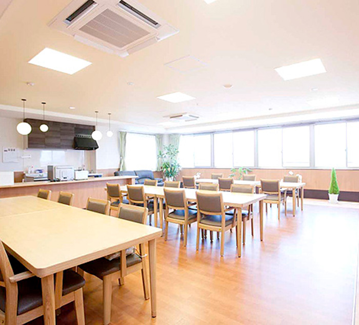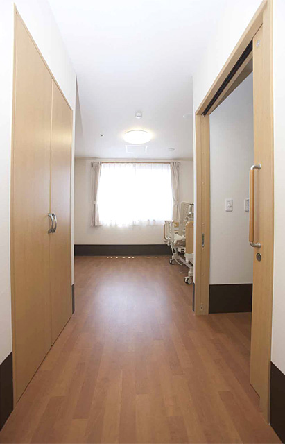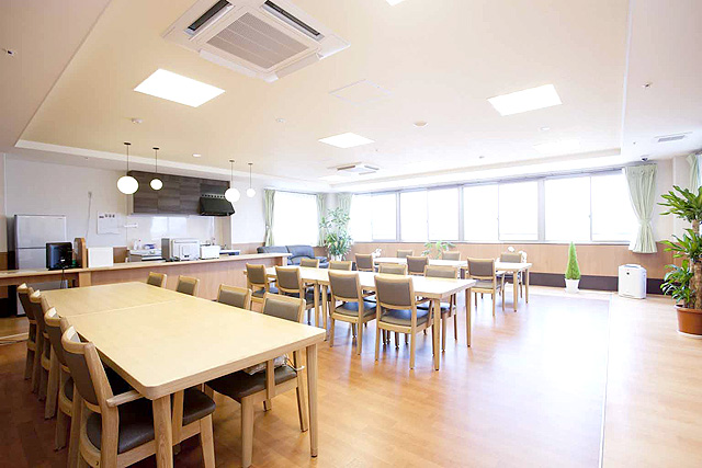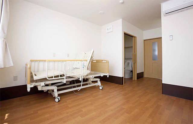 各部屋には電動ベット、ナースコール、トイレ、洗面、収納、冷暖房完備となっており、共有スペースには、食堂、談話室、個人浴室があります。