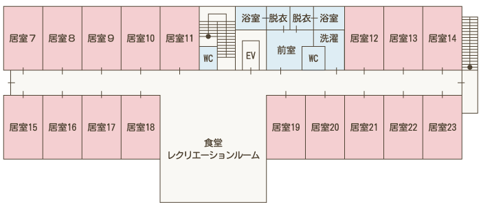 嘉悦館は2階建て全23部屋をご用意しております。全室個室です。